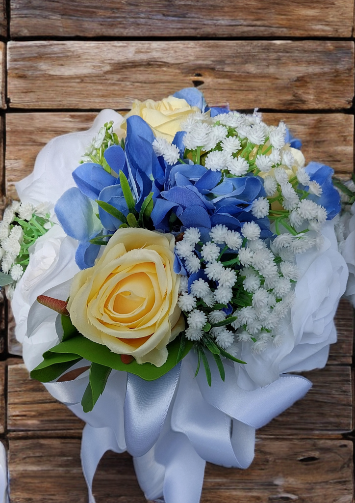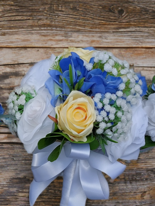 Add a touch of timeless elegance to your wedding with this beautifully curated floral collection in soft blue, white, and yellow tones. Featuring premium roses, lush hydrangeas, delicate gypsophila, and a carefully selected mix of seasonal foliage, each arrangement is designed to create depth, texture, and natural beauty, perfectly complementing your wedding theme.