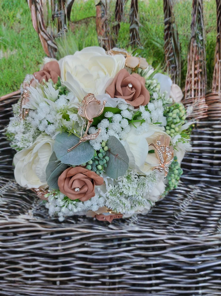 Walk down the aisle with a breathtaking neutral wedding bouquet, featuring soft mocha and cream roses, airy Queen Anne’s lace, and sparkling blush crystal brooches for a touch of timeless elegance.