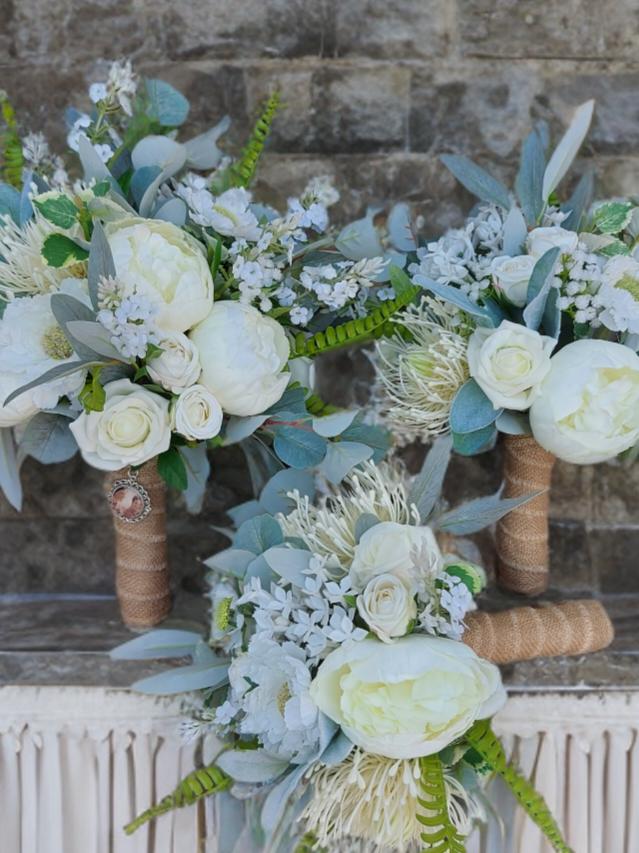 A beautifully balanced design that radiates natural charm and sophistication. This exquisite collection showcases a soft ivory and green palette, thoughtfully arranged in a loose, organic style. Featuring a stunning selection of roses, peonies, meadow spray, scabiosa, and protea, each bloom is complemented by rich, textured greenery to create a look that feels effortlessly romantic and gracefully classic. Perfect for both traditional and modern weddings, this collection adds a fresh, refined touch to your special day.